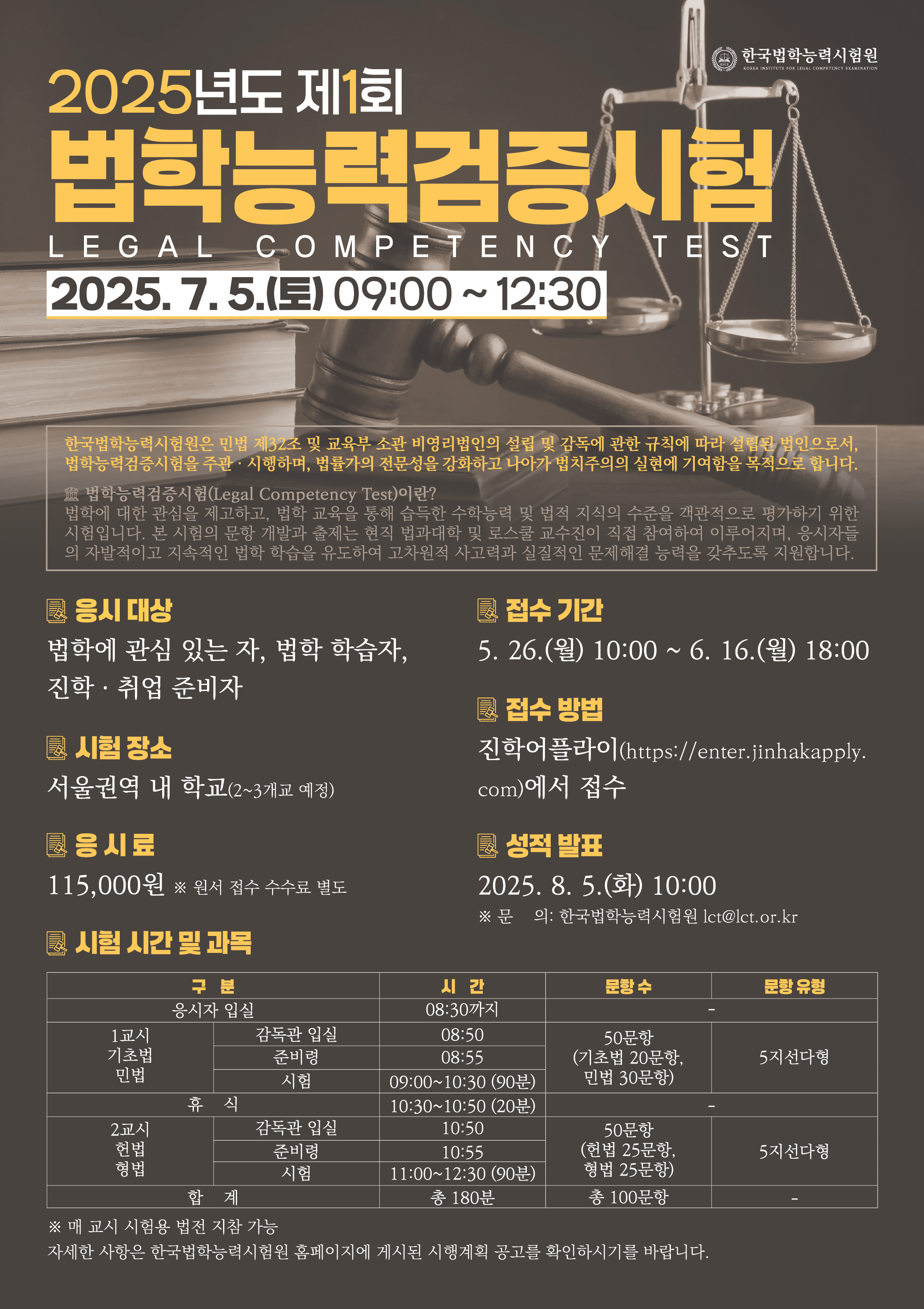 시험원 소개 법학능력검증시험 알림마당 자주하는 질문 KILCE Korea Institute For Legal Competency Examination 이사장 인사말 설립 목적 및 주요 업무 기구표 찾아오시는 길 시험 소개 시행계획 공고 시험 접수 성적 확인 정답 공개 공지사항 보도자료 언론기사 알림마당 알림마당 시험원 소개 법학능력검증시험 알림마당 자주하는 질문 공지사항 공지사항 보도자료 언론기사 공지사항 2025년도 제1회 법학능력검증시험 홍보 포스터 관리자 2025-05-02 조회694 ▶ 시험 접수 바로가기 첨부파일 2025년도 제1회 법학능력검증시험 홍보 포스터.png 목록